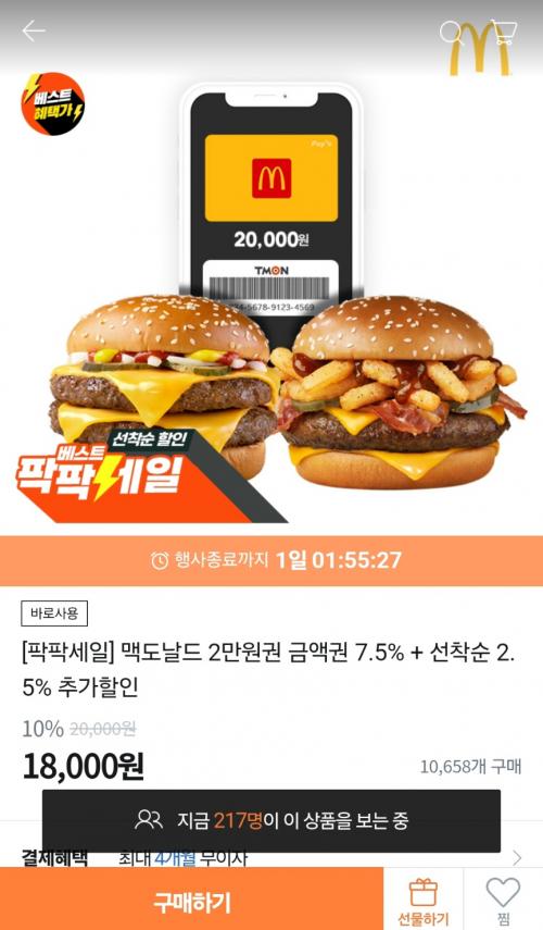 [티몬] 맥도날드 금액권 2만원권 (18,000원/무료) > 국내핫딜