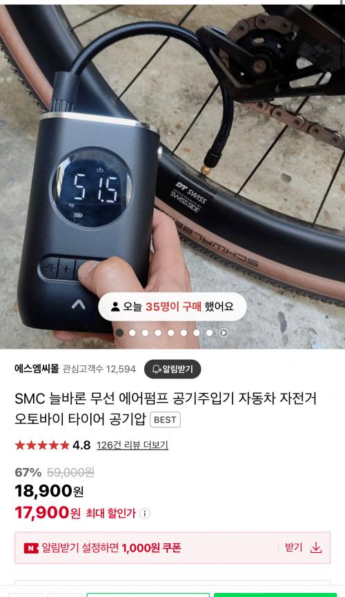 [네이버] SMC 늘바론 무선 에어펌프 공기주입기 자동차(17,900원/무료)