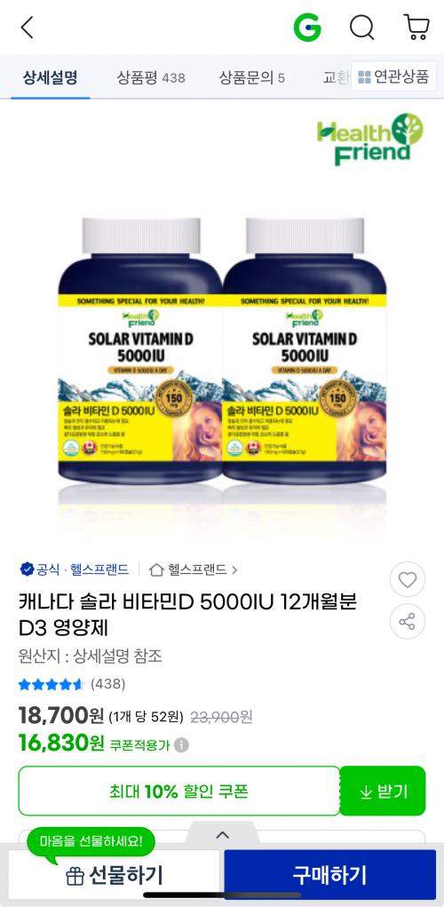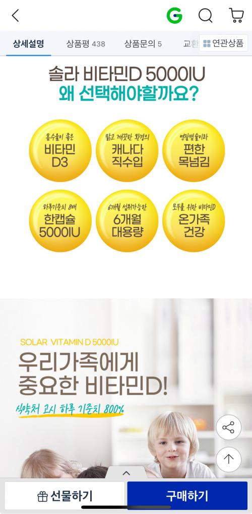 캐나다 직수입 제품이고 1캡슐에 비타민D 5000IU 함유라 좋네요 사무직이라 실내 활동 많으신분들 챙겨드시면 좋을 것 같습니다 ㅎㅎ