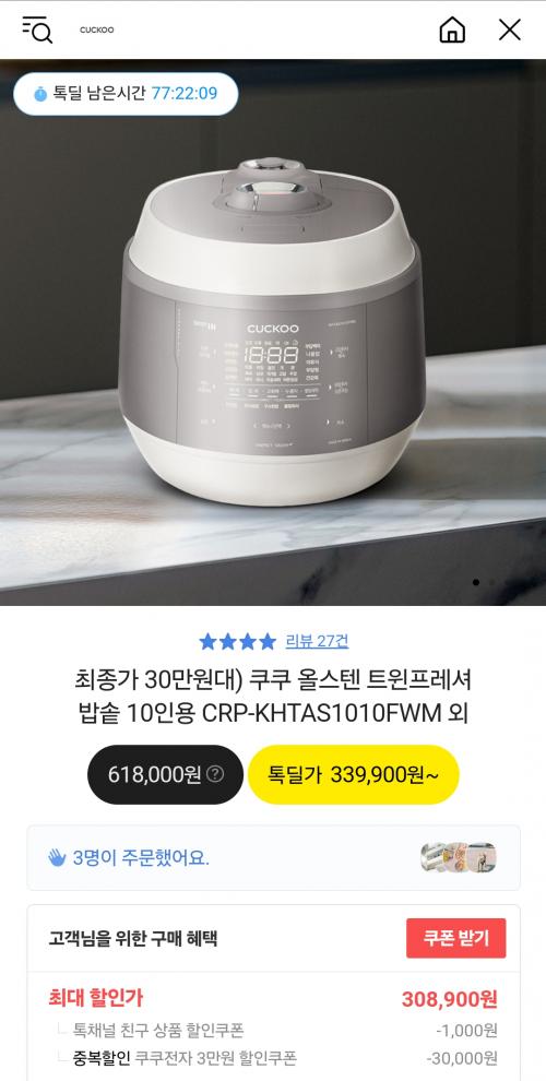 [카카오] 쿠쿠 올스텐 트윈프레셔 밥솥 (309,900원/무배) > 국내핫딜