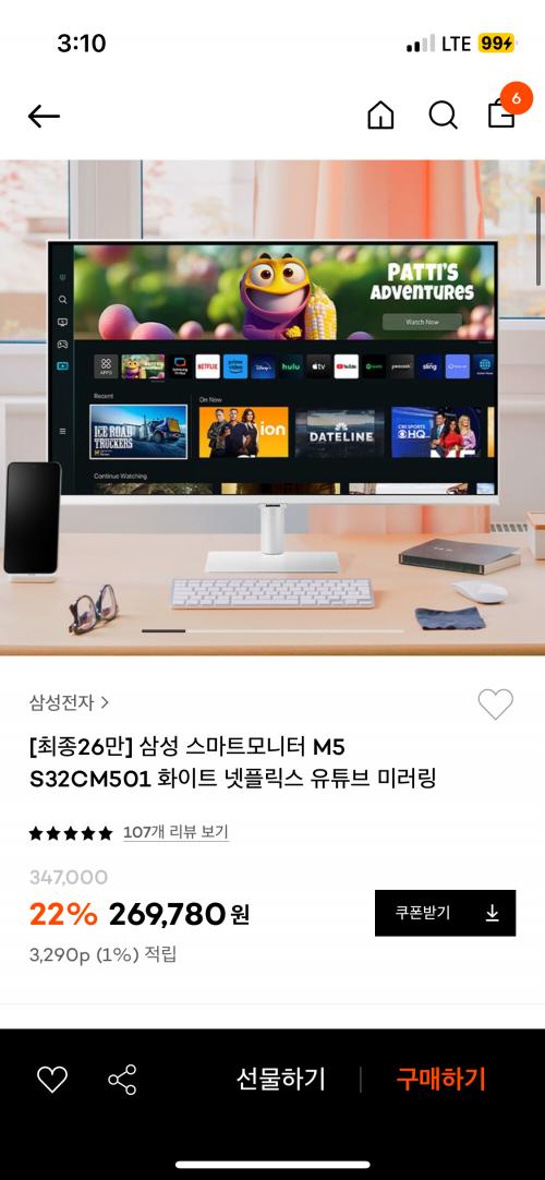 [29cm] 삼성 스마트모니터 M5 S32CM501 화이트(269,780원/무료)
