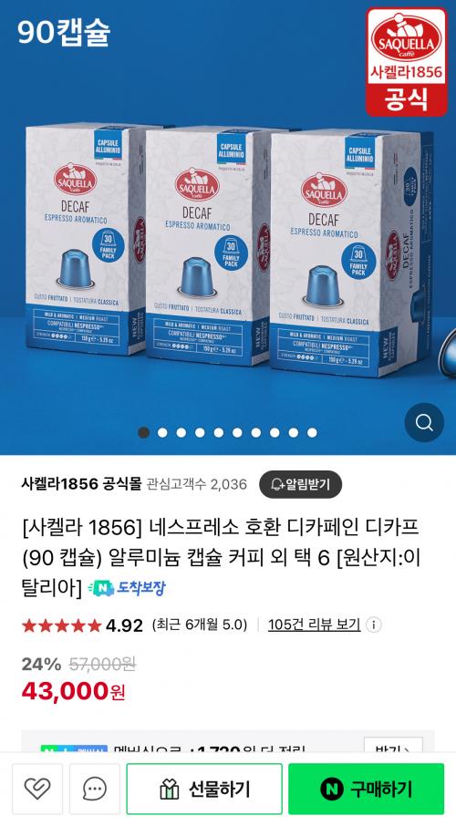 디카페인 캡슐커피 90개 네이버포인트 최대 6,500원 받을 수 있어서 체감가는 캡슐당 370원대네요