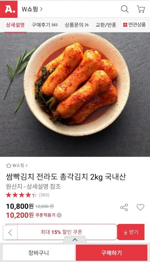 [옥션] 쌈박김치 국내산 전라도 총각김치 2kg (10,200/무료) > 국내핫딜