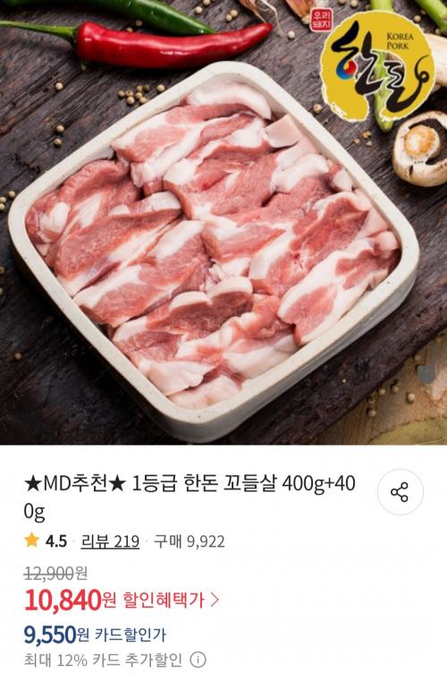 [위메프] 1등급 한돈 꼬들살 400g+400g (9,550원/무배) > 국내핫딜