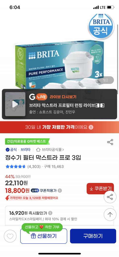 [지마켓] 브리타 정수기 필터 막스트라 프로 3입 (16,920원/무배) > 국내핫딜