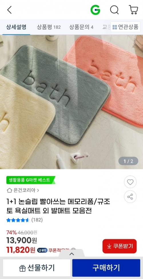 [G마켓] 1 + 1 논슬립 빨아쓰는 메모리폼/규조토 욕실매트 모음전 (11,820/무배) > 국내핫딜
