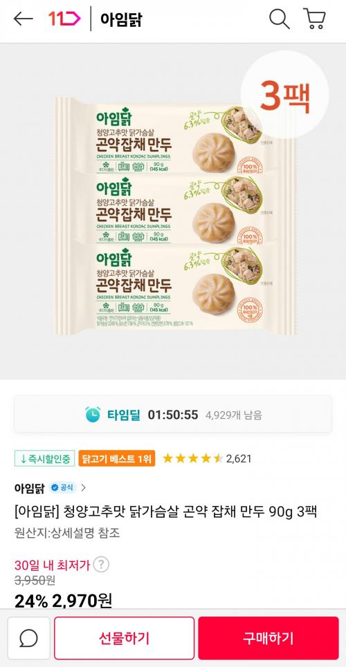 [11번가] 청양고추맛 닭가슴살 곤약 잡채 만두 90g 3팩 2,970원 > 국내핫딜