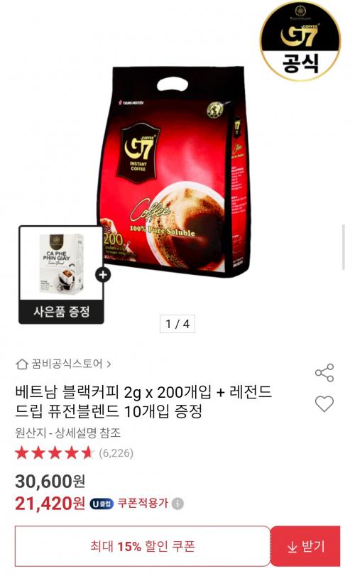 [옥션] G7 블랙커피 200개입 + 레전드 드립커피 본품 증정 (21,420원/무배) > 국내핫딜