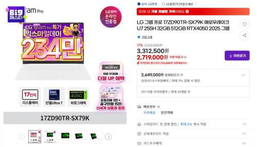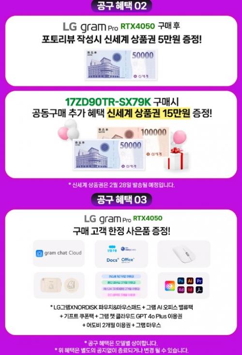 모바일 신세계 상품권 15만원이랑 포토리뷰 작성시 신세계 상품권 5만원 증정 있어서 2,449,000원까지 체감가 나오네요