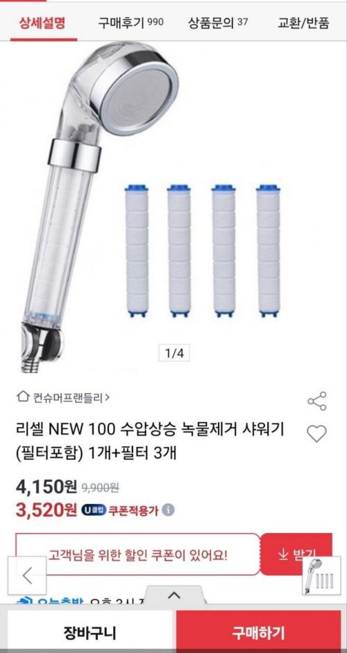 샤워기에 필터도 포함되어 있고 필터도 3개 더 주니깐