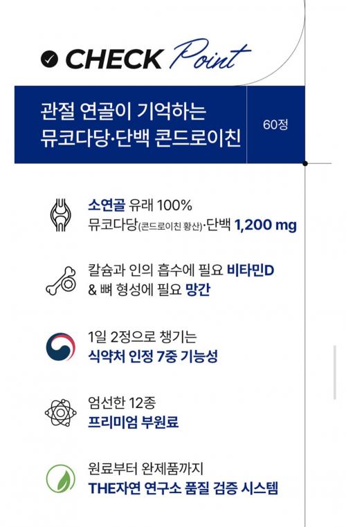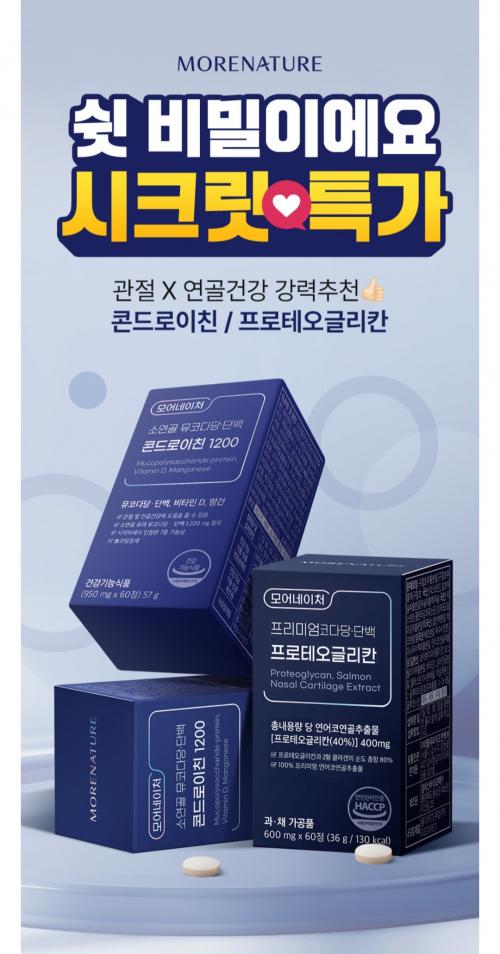 1캡슐에 관절, 연골 건강에 도움되는 콘드로이친 뮤코타당 단백 1200mg + 비타민D + 망간까지 포함되어있고 2개월분에 26,900원으로 나오는데 가격 좋네요