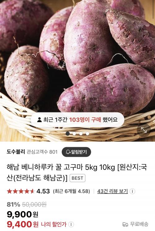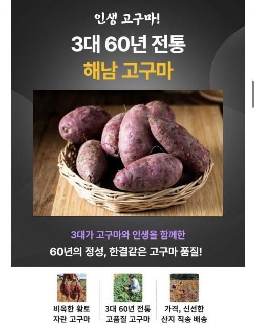 [네이버] 해남 베니하루카 꿀고구마 중상3kg (9,400원/무배)