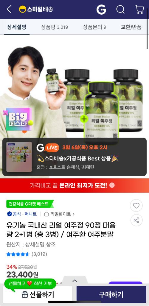 국내산 여주정인데 90정씩 대용량인데 2+1해서