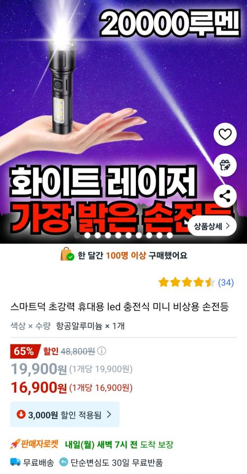 [쿠팡] 스마트덕 초강력 휴대용 led 충전식 미니 비상용 손전등 (16,900원/무배) > 국내핫딜
