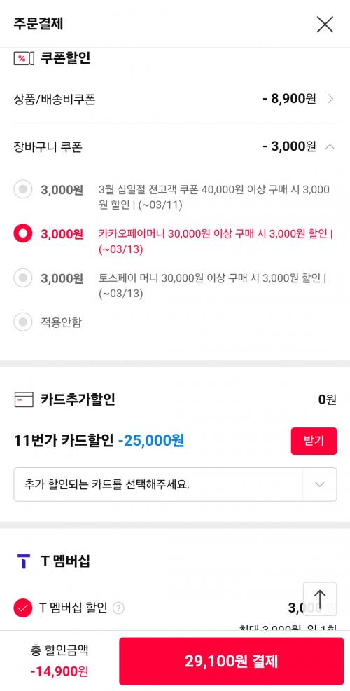 티멤버십 적용 후, 카카오페이결제시 29,100원까지 나옵니다.