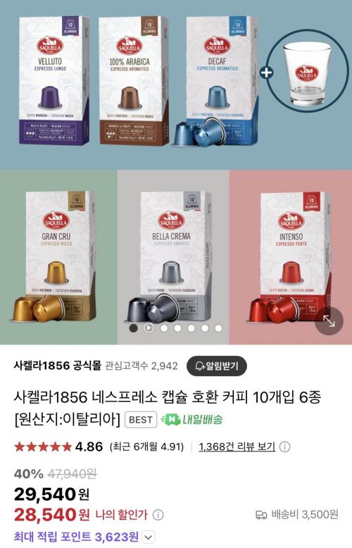 100개짜리 옵션 선택시에는 아라비카,벨루토를 39,900원으로 개당 399원 으로 행사 하고있네요,