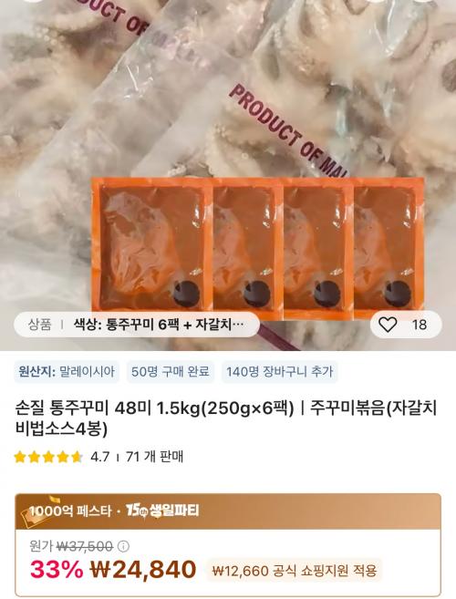 손질 통쭈꾸미 48미 250g x 6팩 20,598원 입니다