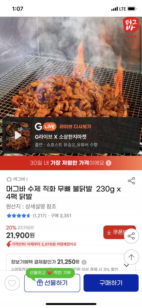 [지마켓] 수제 직화 무뼈 불닭발 230g x 4팩 (21900원/무배) > 국내핫딜