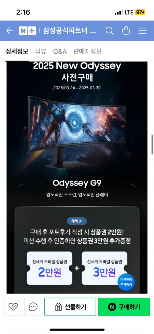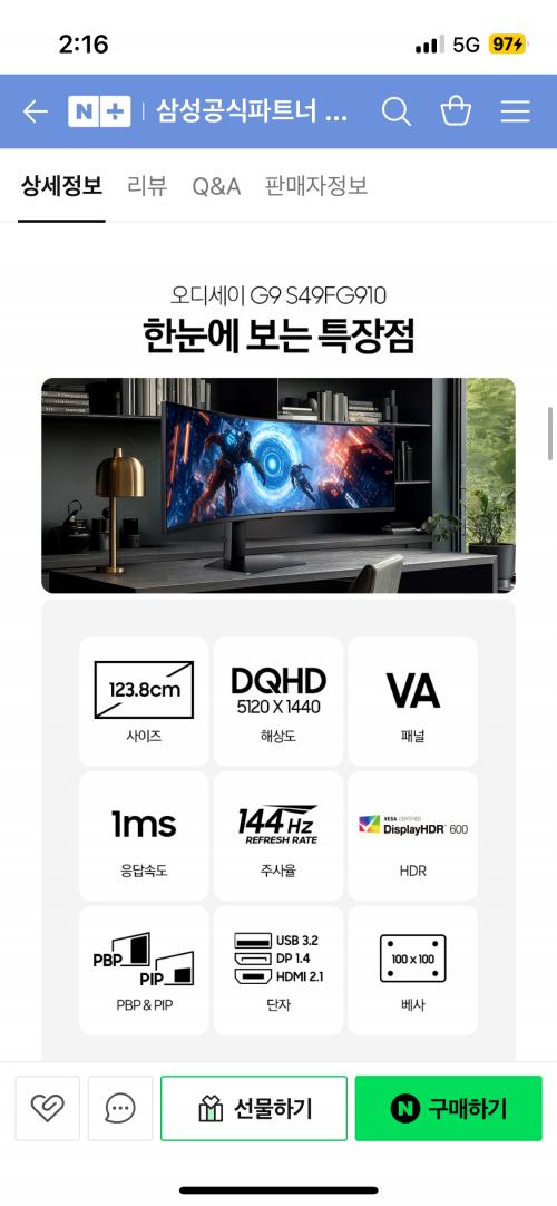 [네이버] 삼성 오디세이 G9 S49FG910 123.8cm(49인치) 울트라 와이드 게이밍 모니터(1,169,000원/무료)