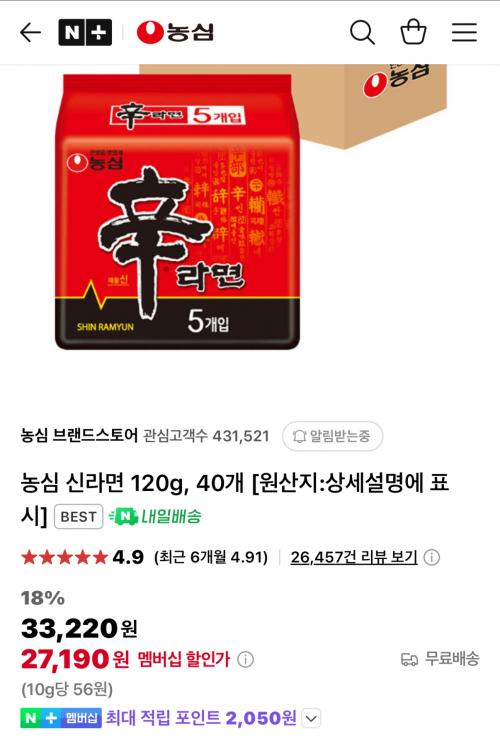 [네이버] 농심 신라면 40개 (27,190원/무배)