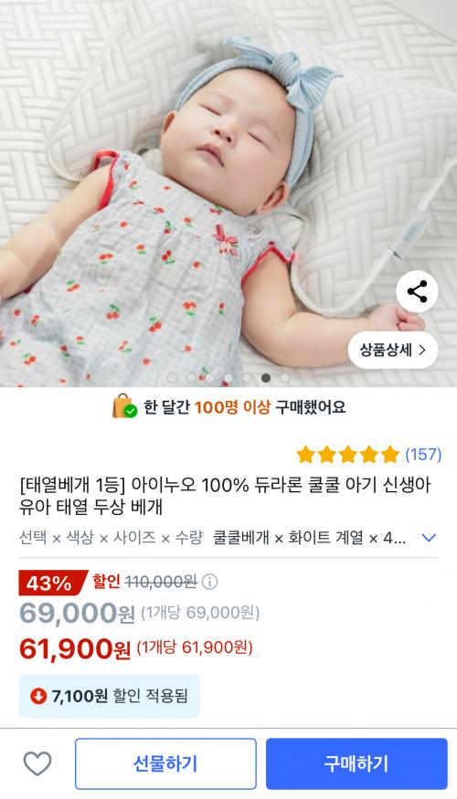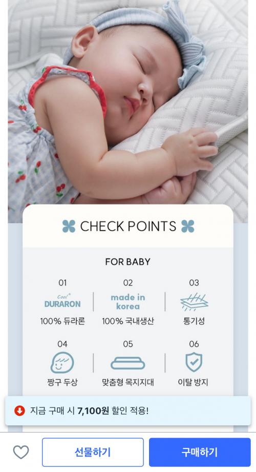 [쿠팡] 아이누오 듀라론 아기 태열베개 (61,900원/무배) > 국내핫딜
