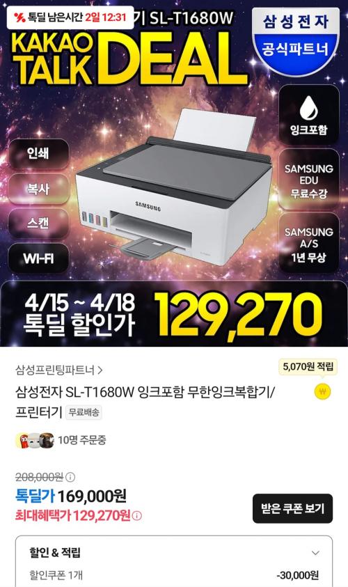 [톡딜] 삼성전자 무한잉크복합기 (129,270/0) > 국내핫딜