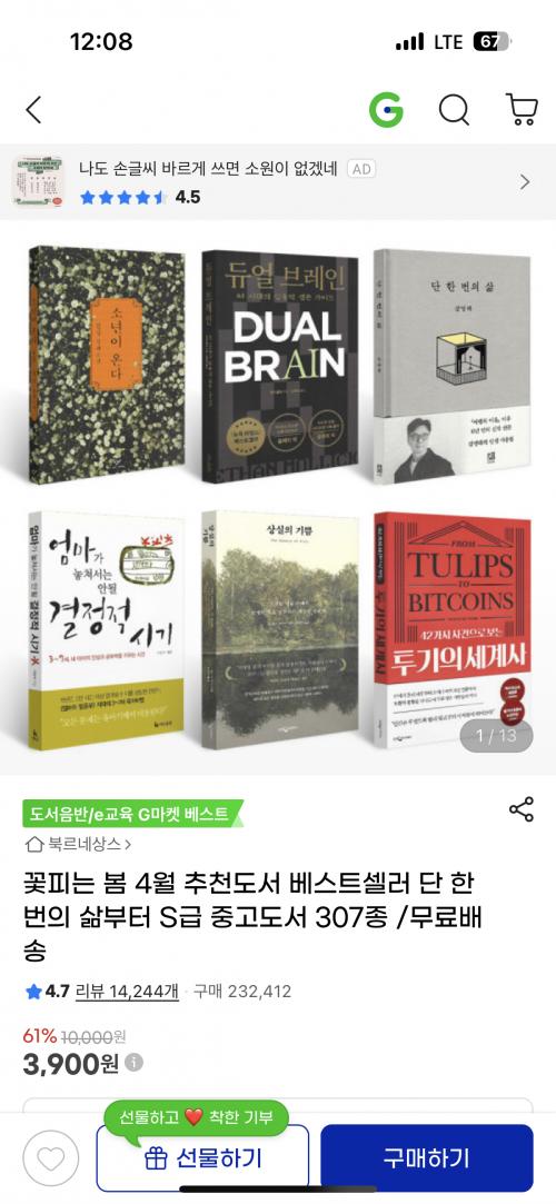 [지마켓] 꽃피는봄 4월 추천도서 신간 + S급 중고도서 307종 (3,900원~/무료) > 국내핫딜