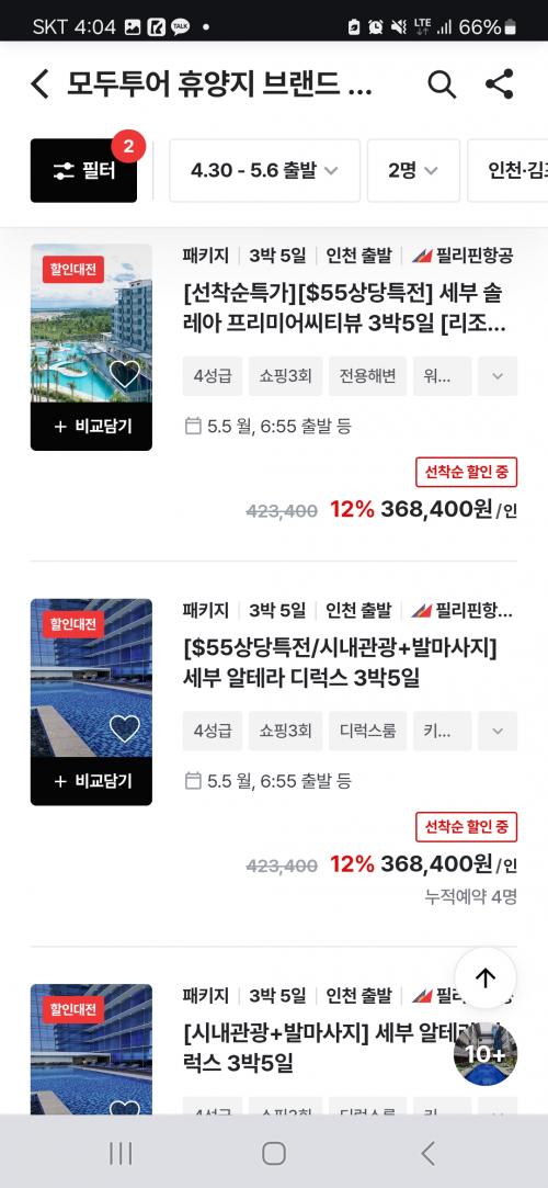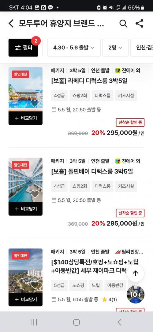 보홀 3박5일 295,000원부터 세부 3박5일 368,400원부터 있네요.
