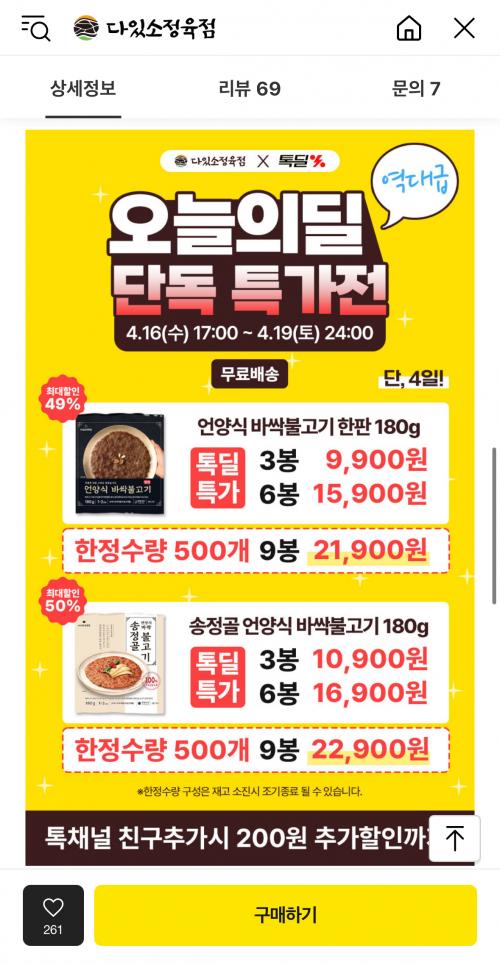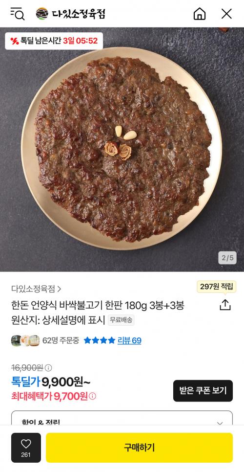 [카카오톡딜] 한돈 언양식 바싹불고기 한판 180g 3봉 (9,700원/무료배송) > 국내핫딜