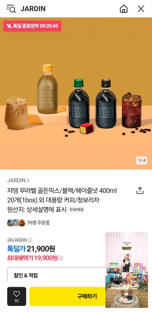 [톡딜] 쟈뎅 편의점 커피/음료 골든믹스 400ml 20개 (19,900/무료) > 국내핫딜