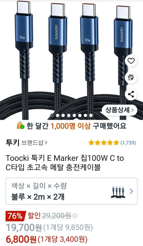 [쿠팡] Toocki E Marker 칩100W C to C타입 초고속 메탈 충전케이블 2m 2개입 (6,800원/무배) > 국내핫딜