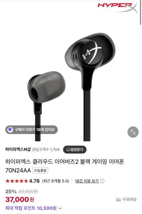 [네이버] 하이퍼엑스 클라우드 이어버즈2 블랙 게이밍 이어폰 (37,000원/무배) > 국내핫딜