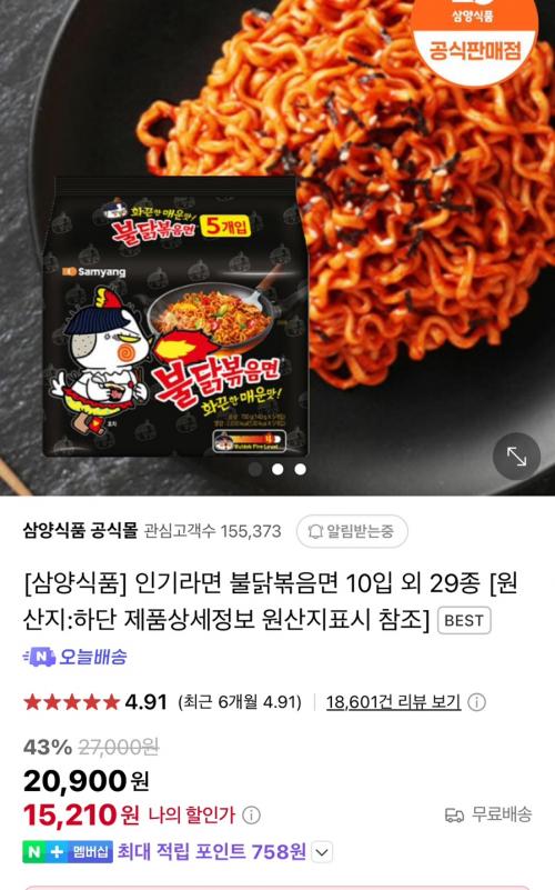 삼양 불닭볶음면 일반쿠폰 + 선착순 쿠폰 적용시 16,720원 가격 나옵니다
