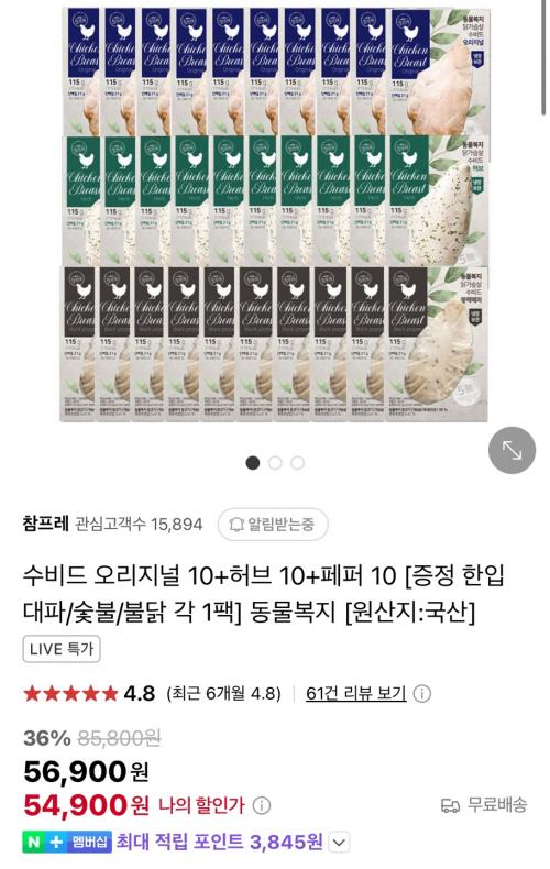 [네이버] 참프레 수비드 오리지널 10+허브 10+페퍼 10 냉장 닭가슴살 + 증정 3팩 (56,900원/무료)