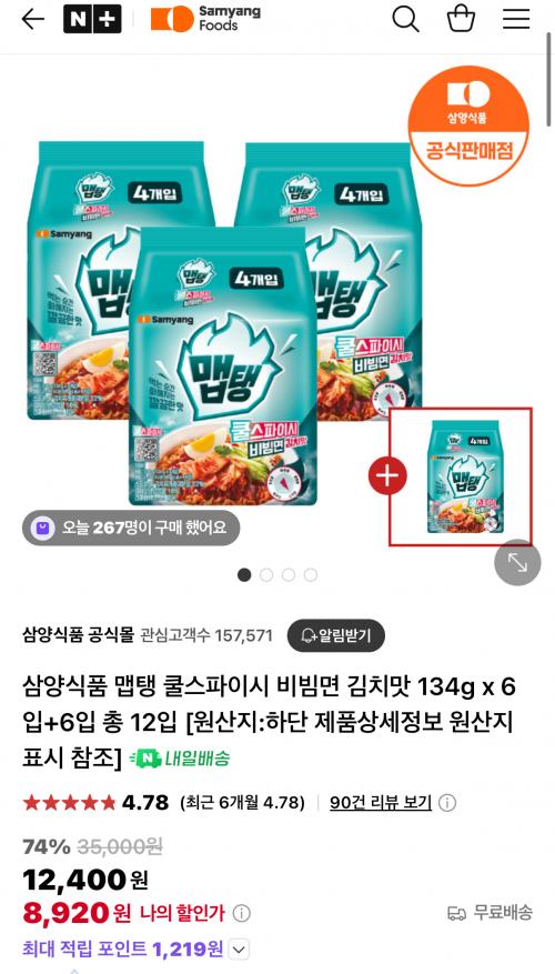 [네이버]삼양식품 맵탱 쿨스파이시 비빔면 김치맛 134g x 6입+6입 총 12입(8,920원/무배) > 국내핫딜