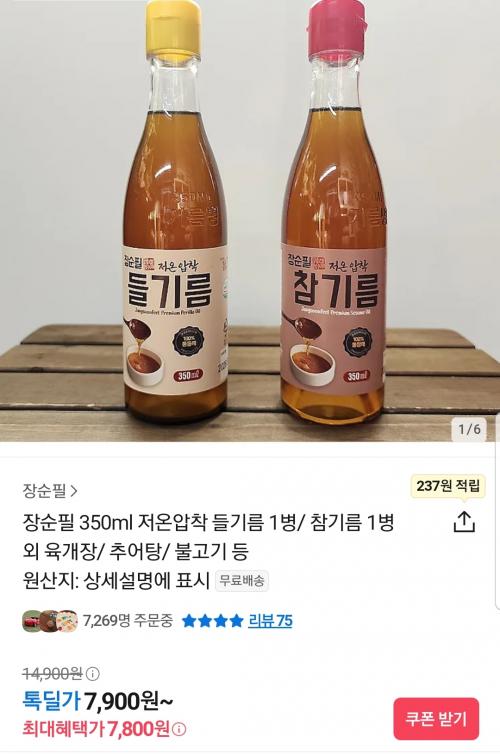 [톡딜] 장순필 저온압착 참기름/들기름 1병 350ml (7,900원/무료) > 국내핫딜