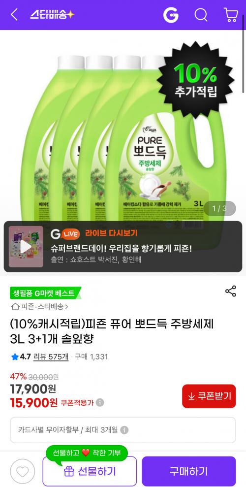 [지마켓] 피죤 퓨어 뽀드득 주방세제 3L 3+1개 솔잎향 (15,900원/무료) > 국내핫딜