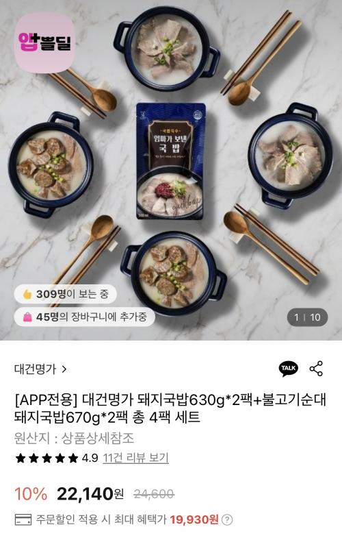 [롯데온] 대건명가 돼지국밥 2팩+불고기순대 돼지국밥 2팩 총4팩 (19,930원/무료)