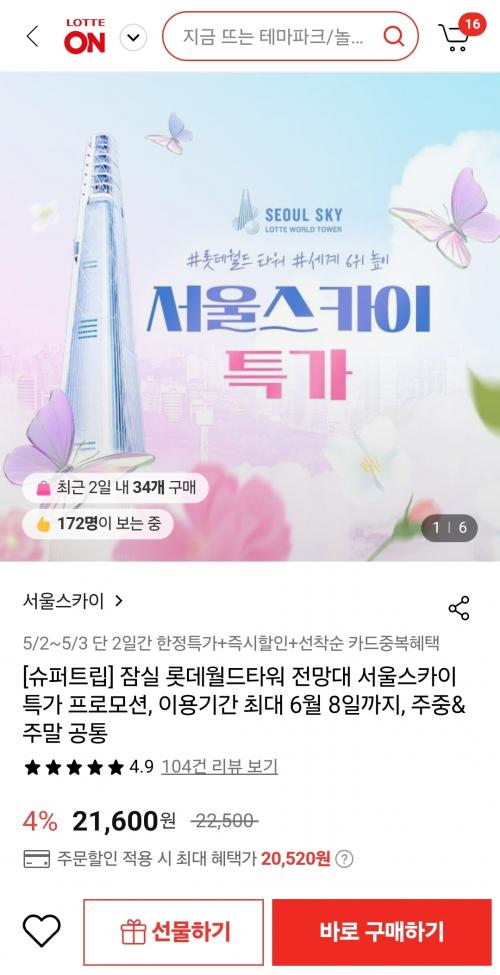 [롯데온] 롯데월드타워 전망대 서울스카이 입장권 (20,520원/무료) > 국내핫딜