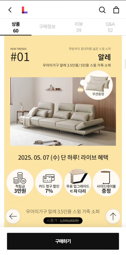 ㄷ자 다리 무료 업그레이드 + 사이드테이블 사은품증정 있습니다. 롯데백화점상품권3만원 증정 + 적립금3만원 + 카드할인가 = 총 체감가 45만원대 나옵니다.