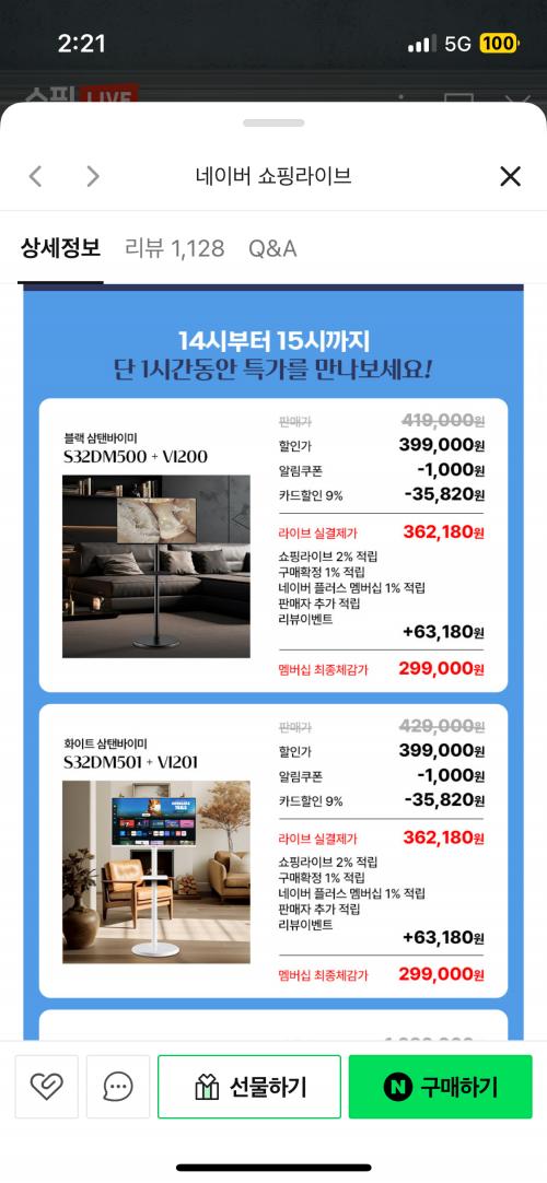 [네이버] 삼성 삼탠바이미 패키지 블랙/화이트 라이브 특가(299,000원/무료)