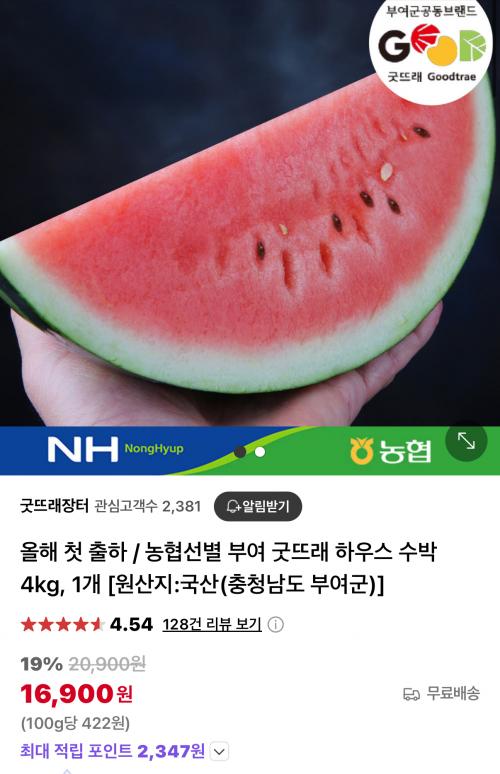 [네이버] 농협선별 부여 굿뜨래 하우스 수박4kg 1개(16,900원/무배)