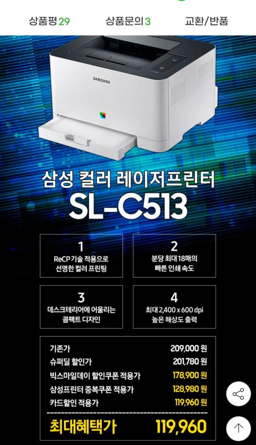 [G마켓] 삼성전자 SL-C513 컬러레이저프린터 (119,960원/무배) > 국내핫딜