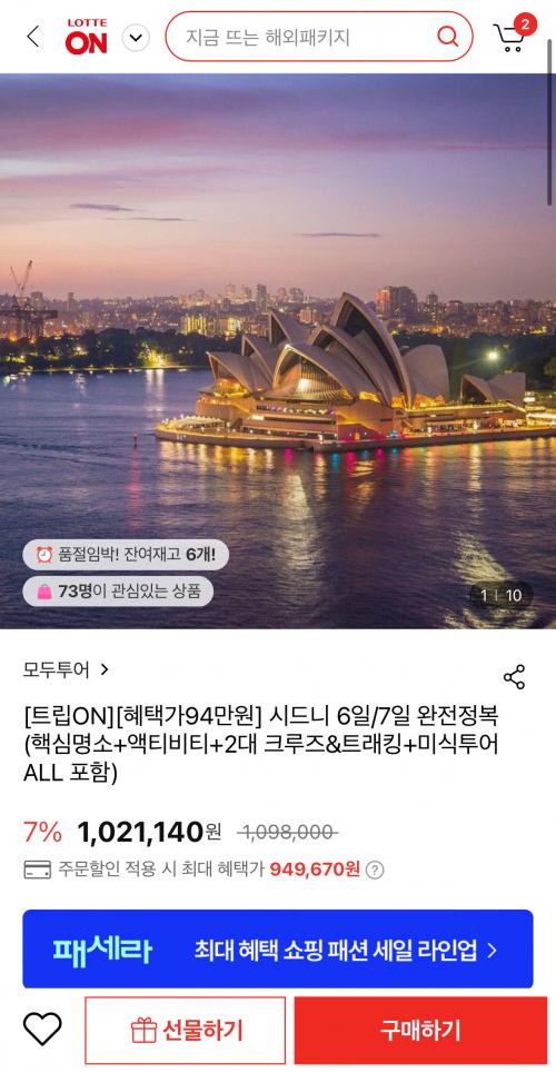 [롯데온] 호주 시드니 6/7일 패키지 이용권 (949,670원/무료)