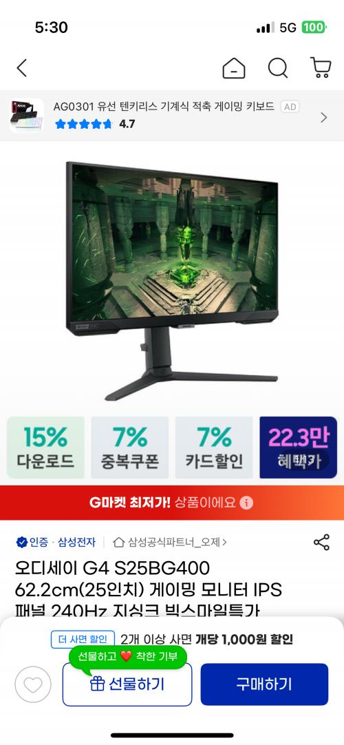 [지마켓] 오디세이 G4 S25BG400 62.2cm(25인치) 게이밍 모니터 IPS 패널 240Hz 지싱크 빅스마일특가(223,640원/무료)