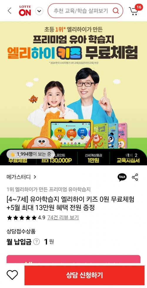 [롯데온] 메가스터디 유아학습지 엘리하이 키즈 0원 무료체험 (0원/무료) > 국내핫딜