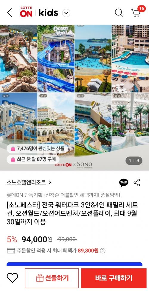 [롯데온] 소노호텔앤리조트 워터파크 3인권 (89,300원/무료) > 국내핫딜