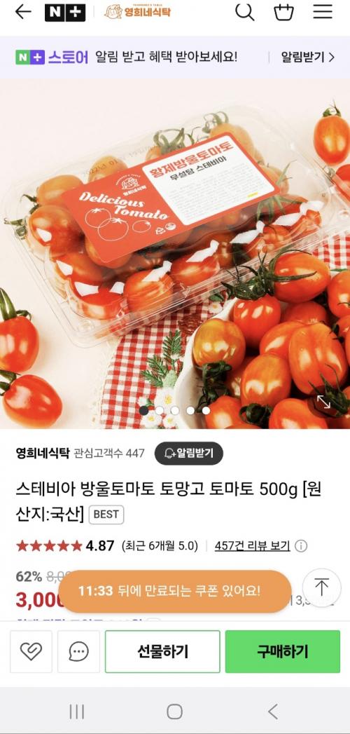 스테비아 방울 토마토 소분으로 1팩당(500g) 3,000원 입니다