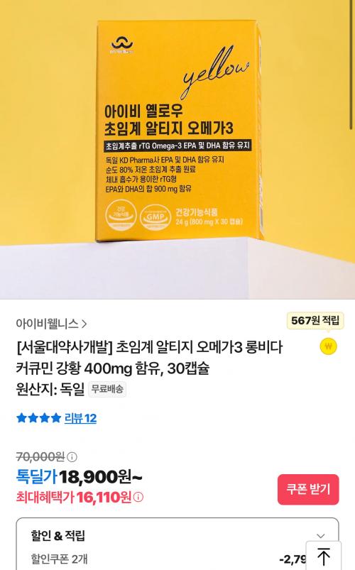 [카카오]초임계 알티지 오메가3 롱비다 커큐민 강황 400mg 함유, 30캡슐(16,110원/무배) > 국내핫딜