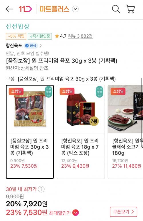 [11번가] 원 프리미엄 육포 30g 3봉 (7,920원/무료) > 국내핫딜